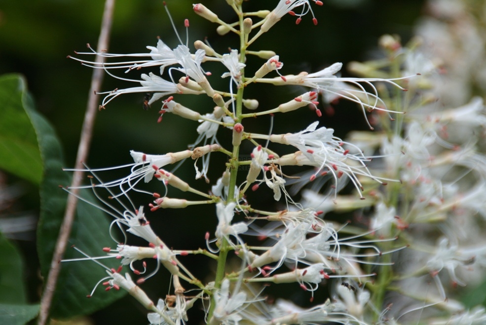 Die Blütenstände sind aufrechte, 20–30 cm lange Rispen mit weißen, 2–3 cm langen Einzelblüten. Die Staubfäden sind mit bis zu 4 cm länger als die Kronblätter und rötlich. Später bilden sich bis 4 cm im Durchmesser große, eiförmige, hellbraune Früchte.