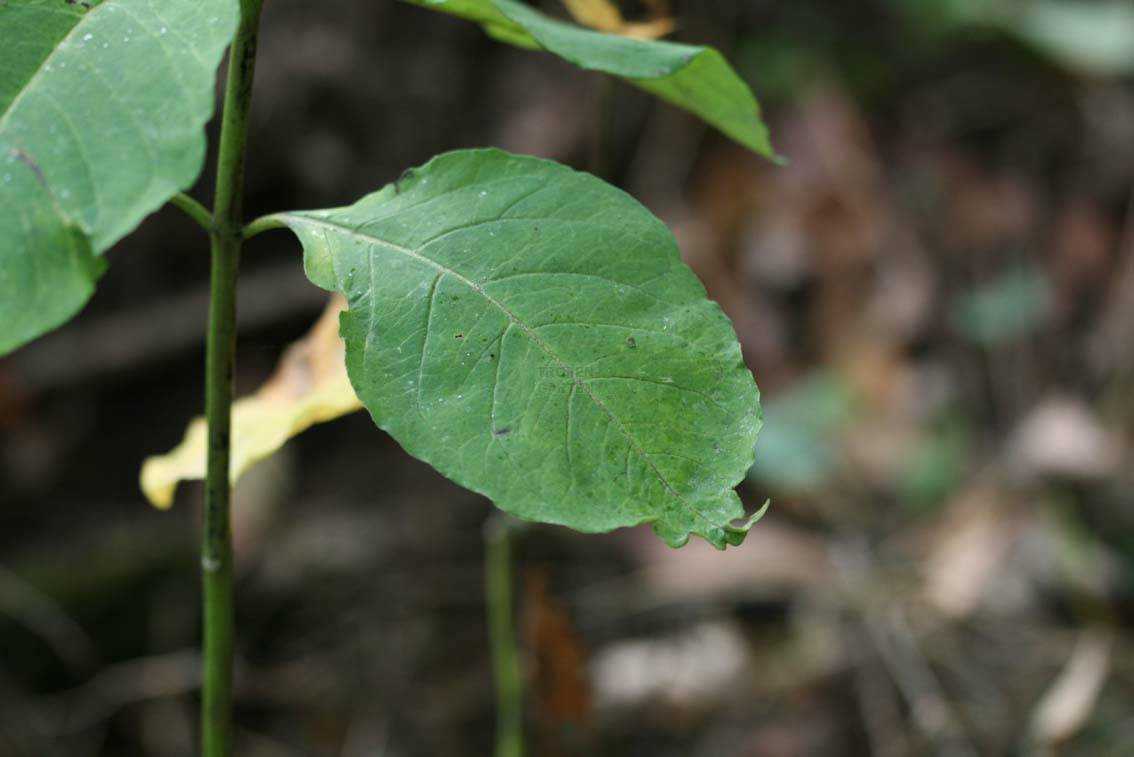 Die Stängel sind aufrecht, Milchsaft führend, unverzweigt und in Linien behaart. Die Laubblätter sind 4–18 mm lang gestielt, gegenständig, selten quirlständig, eiförmig, lanzettlich oder elliptisch, ganzrandig, bewimpert, 6–20 cm lang, 2–10 cm breit, beidseits behaart.
