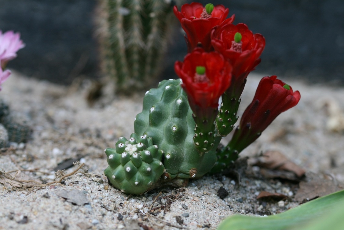 Echinocereus triglochidiatus gehört zu den robusten Kakteen, die mit Nässeschutz sich zum Anbau im Freiland eignen. Ein sonniger, möglichst trockener Standort im Sukkulentenbeet ist ideal. Die Art blüht zuverlässig mit attraktiven Farben und bildet keimfähige Früchte im Freiland.