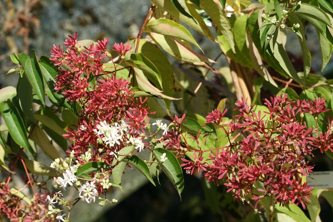 Die Blütenstände sind pyramidenförmige, 5–15 cm lange Rispen, die aus mehreren Teilblütenständen bestehen. Die Einzelblüten sind weiß, duftend und 5-zählig mit purpurfarbenen, bis 2,5 mm langen, persistierenden Kelchen. Später bilden sich zylindrische, bis 1 cm lange Nussfrüchte, mit jeweils 1 Samen.