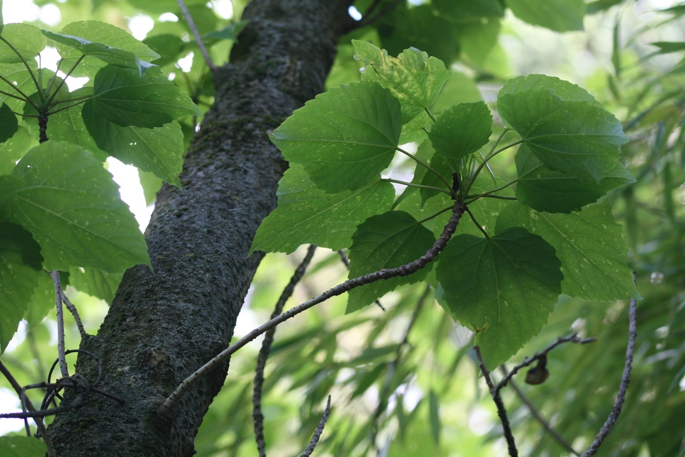 Es sommergrüne Bäume mit grauer, nicht abblätternder Rinde. Die Zweige sind kahl oder spärlich flaumig behaart. Die Laubblätter sind breit eiförmig, 6–20 cm lang, 4–20 cm breit, ledrig, randständig gesägt, oberseits dunkel grün und meist kahl, unterseits an der Basis mit behaartem Fleck. Die Blattstiele sind rötlich, kahl und 4–15 cm lang. Die Blütenstände sind 13–30 cm lange Rispen mit flaumig behaarter Blütenstandsachse. Die Blüten sind gelblich-grün mit 1–1,5 cm langen, flaumig behaarten Blütenstielen und 3–10 mm langen, lanzettlichen, papierartigen, gezähnten oder gelappten Tragblättern. Männliche Blüten sind 1,2–1,6 cm im Durchmesser und haben 5–6 mm lange, 2–3 mm breite, ovale bis verkehrt eiförmige, flaumig behaarte Kelchblätter. Weibliche Blüten sind 1,2–1,6 cm im Durchmesser mit 4–5 mm langen und etwa 2,5 mm breiten, flaumig behaarten Kelchblättern. Später bilden sich purpurrote bis orangerote, kugelige, 8–10 mm im Durchmesser große Beeren. Die Samen sind rötlich-braun bis purpurbraun, 2–3 mm lang und breit eiförmig.