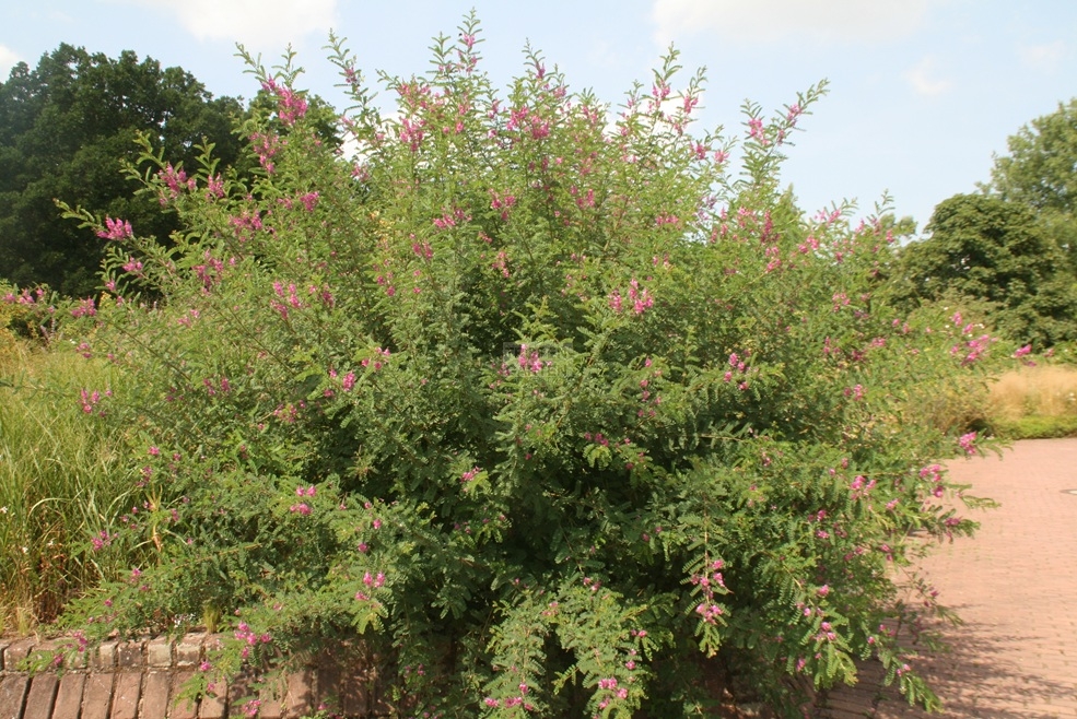 Im Sommer bis in den Herbst hinein finden sich traubige, endständige, 2,5–9 cm lange Blütenstände mit roten Einzelblüten. Zum Herbst bilden sich kahle oder behaarte, 2,5–3 cm lange, lineare Hülsenfrüchte, die jeweils 5–12 Samen enthalten.