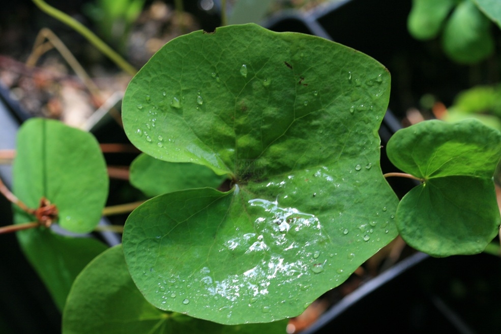 Die Pflanzen sind kahl und weisen 4–6 Laubblätter oder Blühtriebe pro Jahr auf. Das Rhizom ist hell gelb. Die Laubblätter sind nierenförmig bis fast rund mit tief herzförmiger Basis, 6–8 × 9–10 cm groß, ganzrandig oder mit umgeschlagenem Rand, oberseits anfangs rot, später grün und unterseits graugrün. Die Blattstiele sind 10–30 cm lang.