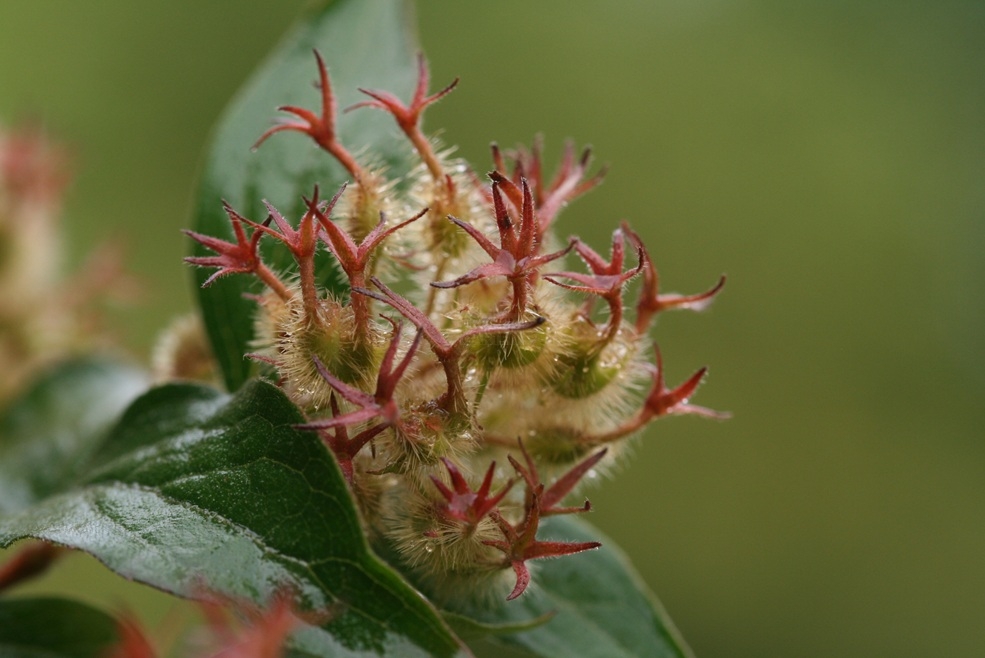 Die Pflanzen wachsen aufrecht bis überhängend mit mehreren, hellbraunen Stämmchen. Die Zweige sind behaart, später verkahlend. Die Laubblätter sind gegenständig, eiförmig bis elliptisch, 3–8 cm lang, 1,5–2,5 cm breit, beidseits flaumig behaart, meist ganzrandig, selten gezähnt, mit 1–2 mm langem Blattstiel.