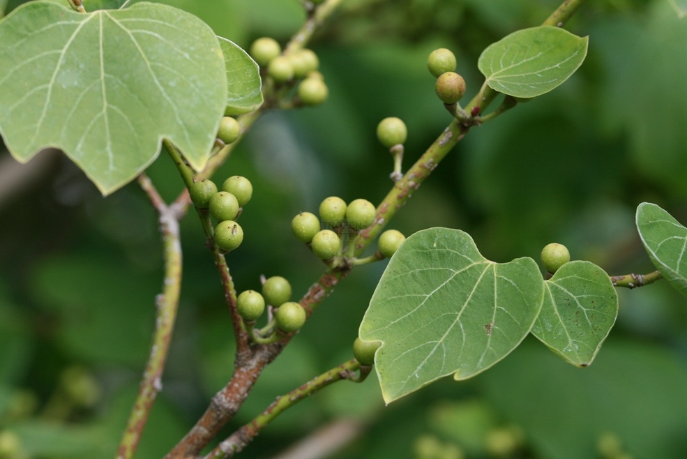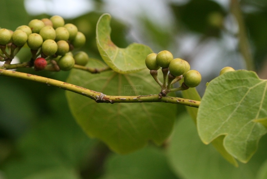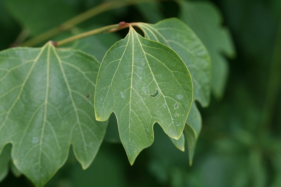Es sind laubabwerfende Sträucher oder kleine Bäume mit 1 oder mehreren, aufsteigenden bis aufrechten Stämmen. Die Borke ist schwarz-braun. Die Zweige sind gelblich-grün, glatt mit Korkwarzen und länglich schilfernder Rinde. Die Laubblätter sind wechselständig, oberseits dunkelgrün und kahl, unterseits flaumhaarig bis verkahlend, blass grün oder manchmal rötlich, fast rund bis elliptisch im Umriss, 5,5–10 cm lang, 4,8–10,8 cm breit, 3(–5)-nervig, 3-lappig und ganzrandig. Die Blattstiele sind 1,5–2,8 cm lang und gelblich-weiß flaumhaarig.