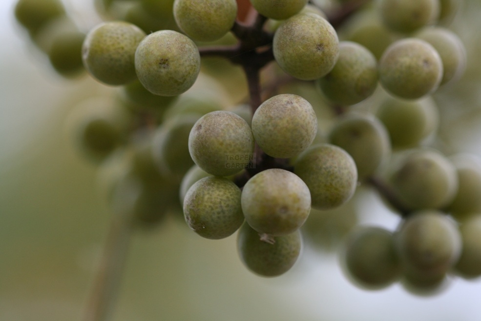 Die Blütenstände sind etwa 15 cm lange, locker verzweigte Rispen. Die Einzelblüten sind gestielt, gelblich-grün, 5-zählig und etwa 8 mm im Durchmesser groß. Später bilden sich kugelige, etwa 1 cm im Durchmesser große, anfangs grüne, später schwarze Früchte mit jeweils 1 etwa 6 mm langen und etwa 3 mm breiten Samen.