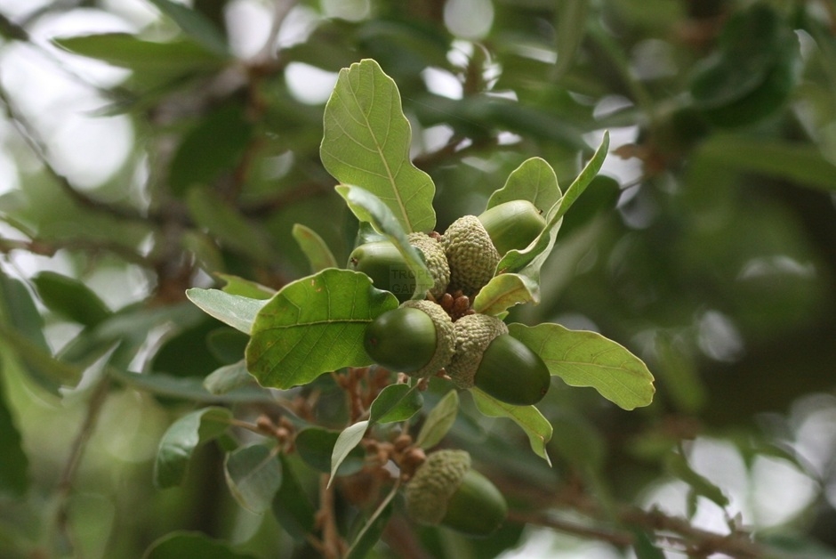 Männliche Blütenkätzchen sind hängend, bis 9 cm lang, gelblichgrün durch die Staubfäden und haben bewimperte, unten verwachsene Hüllblätter. Weibliche Blüten sind unscheinbar mit behaarten Hüllblättern und rötlichen Stempeln. Die Eicheln reifen in 1 Jahr, stehen meist einzeln, sind relativ groß, bis 4 cm lang, rundlich bis zylindrisch, teilweise auch subglobos mit einem Becher, der 1/5 bis 1/3 der Eichel umfasst.