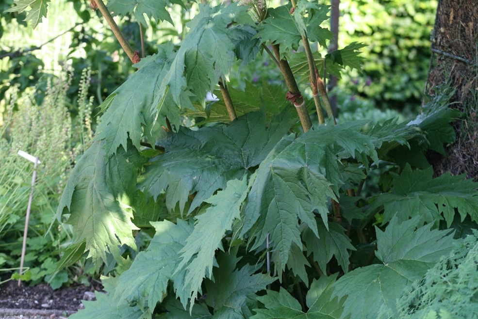 Die Stängel sind aufrecht, hohl, rund, gerieft, kahl oder an den Nodien und im oberen Teil behaart, mit persistierender, bis 15 cm langer, nicht bewimperter Nebenblattscheide. Die Grundblätter sind rundlich, 40–60 cm im Durchmesser groß, handförmig in fiederschnittige Lappen geteilt mit spitzen Blattabschnitten, oberseits mehr oder weniger papillös, unterseits dicht behaart. Nach oben hin werden die Laubblätter kleiner. Die Blattstiele sind rund, etwa so lang wie die Blattspreite, weißhaarig und papillös.