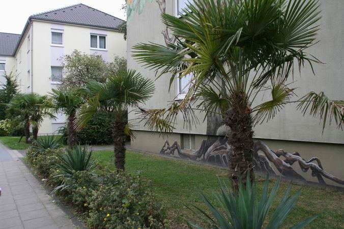 Kleine Trachycarpus-Allee an der Südseite der Wupperstraße. Leichtgradige Winterschäden am alten Blatt.