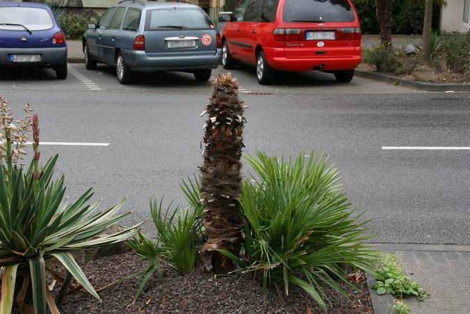 Trachycarpus fortunei an der Südseite der Wupperstraße auf einer Parkbucht, nur geringfügige Winterschäden, kräftiger Neuaustrieb