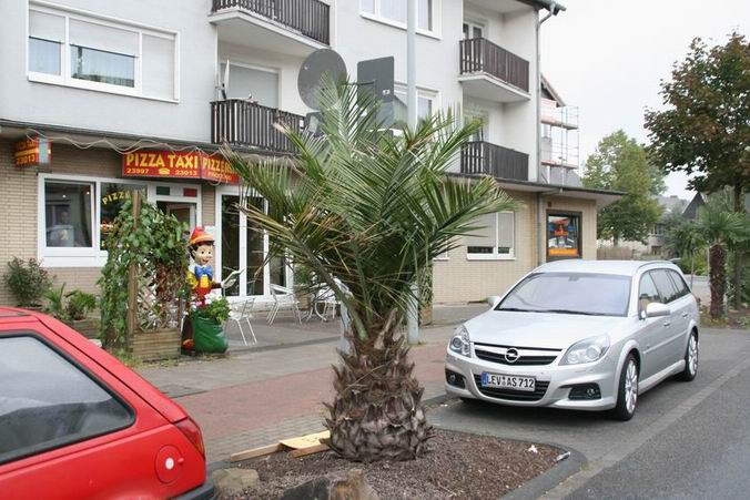 Das dritte, links gepflanzte Exemplar des oben gezeigten 3er-Tuffs vor dem Heilpädagogischen Heim treibt bislang als einziger Trachycarpus fortunei überhaupt nicht mehr aus und soll jetzt kurzfristig ausgegraben sowie in einem Topf neu gepflanzt und dann warm überwintert werden.