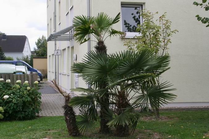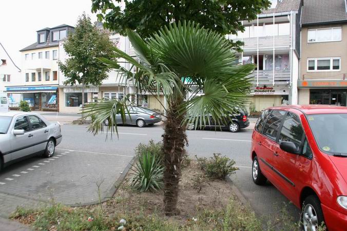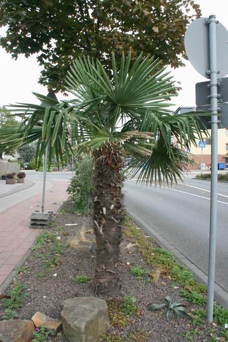 Trachycarpus fortunei an der Südseite der Wupperstraße an einer Parkbucht, nur geringfügige Winterschäden, kräftiger Neuaustrieb
