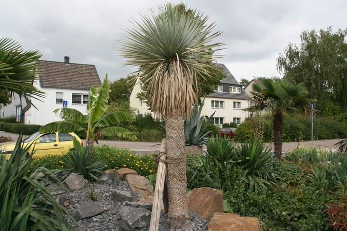 Weiterhin offen bleiben dürfte hingegen die Winterhärte von Yucca treculeana ohne Regenschutz. Zu berücksichtigen ist nämlich, dass das Rheindorfer Exemplar einerseits frisch gepflanzt war und andererseits als bereits von Anfang an leicht vorgeschädigt entsprechend preiswerter erworben wurde. Insofern erschien ein neuerlicher Auspflanzversuch jedenfalls nicht aussichtslos.