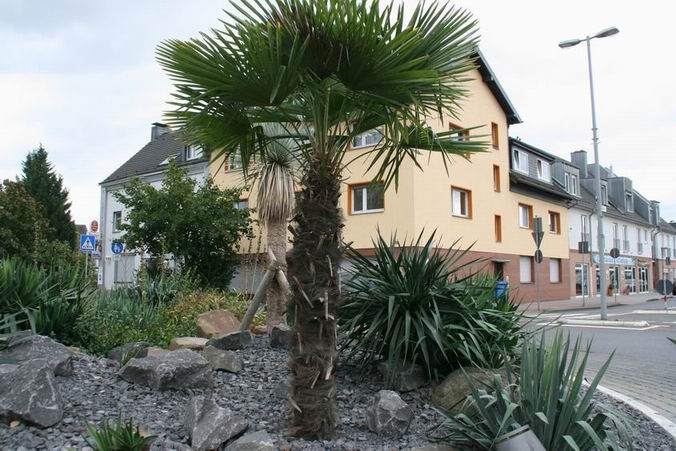 Trachycarpus fortunei auf dem Kreisel, nur geringfügige Winterschäden, kräftiger Neuaustrieb. An diesem sowie am zweiten Exemplar auf dem Kreisel wurde leichter, passiver Schutz angebracht