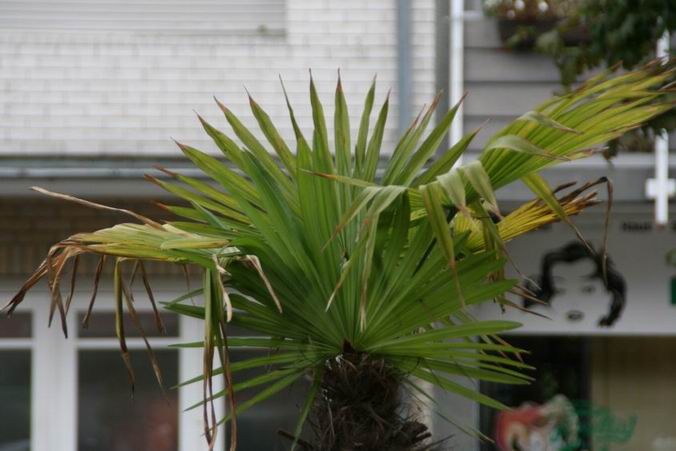 Trachycarpus fortunei an der Südseite der Wupperstraße mit deutlichen Winterschäden, mäßiger und teilweise deformierter Neuaustrieb
