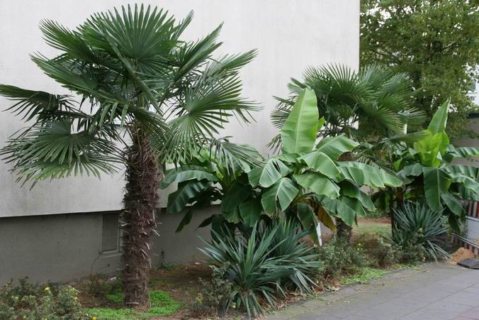 Mischpflanzung von Musa basjoo und Trachycarpus fortunei an der Südseite der Wupperstraße