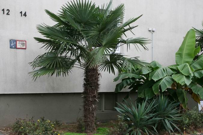 Trachycarpus fortunei an der Nordseite der Wupperstraße, nur geringfügige Winterschäden, kräftiger Neuaustrieb