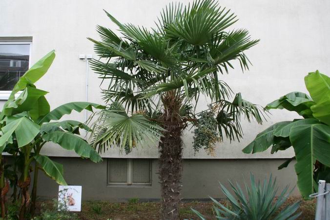 Trachycarpus fortunei an der Südseite der Wupperstraße, geringfügige Winterschäden, kräftige Fruchtbildung, kaum Pseudofrüchte