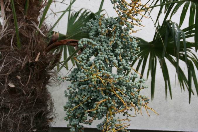 Trachycarpus fortunei an der Südseite der Wupperstraße, kräftiger Fruchtstand