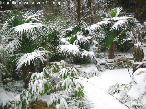 | Thomas Deppert Tecklenburg, nahe Osnabrück, Westdeutschland. Seit 1998 hat Thomas Deppert einen ansehnlichen Exotengarten, in dem einige größere Trachycarpus fortunei, Chamaeropses humilis, Butiae capitatae sowie Braheae armatae ausgepflanzt sind. Zudem finden sich Musa basjoo, Dicksonia antarctica sowie diverse Yucca im Freiland. Durch die Pflanzung von vorwiegend größeren Exemplaren ist trotz des erst jungen Alters seines Gartens ein sehr eindrucksvoller Exotengarten entstanden. .