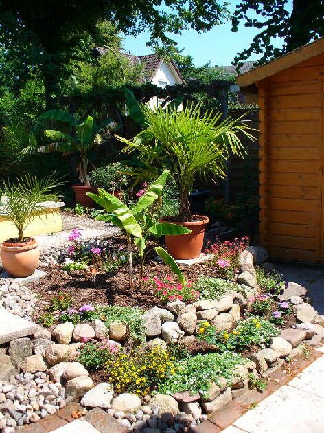 | Jürgen Finnern Bargteheide, etwa 30 km nördlich von Hamburg. Der Garten besteht auf zwei Teilen und umfasst einen exotisch gestalteten Bereich mit einer Fläche von ungefähr 200 m² am Pool (hinter dem Haus), sowie einen Bereich von etwa 150 m² vor dem Haus. Seit etwa 2008 wird der Garten mit Exoten bepflanzt, beispielsweise Musa basjoo, Musa itinerans, Washingtonia robusta, Trachycarpus fortunei und andere Exoten. Manche davon werden im Kübel gehalten.