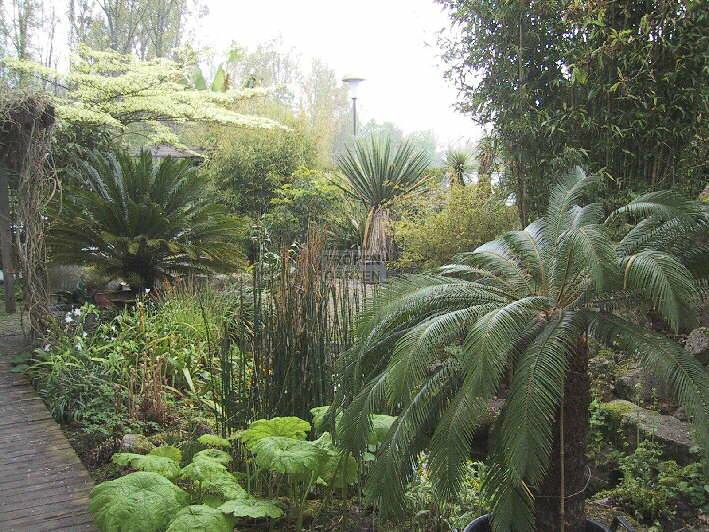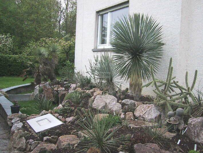 | Norbert Pohl Rheinstetten, ein phantastischer Exotengarten der in mehrere thematische Regionen aufgeteilt ist: Trocken- und Sumpfgarten, Palmen- und Bananenteil, Bambus und immergrüne Raritäten. Fast alle bekannteren Yucca-Arten sind vertreten, zahllose Kakteen und seltene Sukkulenten, wunderschöne Acantholimon-Polster, riesige Bananen und Freilandorchideen. Seit Jahren ausgepflanzte Palmen sind Trachycarpus fortunei, T. takil, T. wagnerianus, Chamerops humilis und C. humilis v. cerifera, letztere hat sogar die 94/95 und 96/97 Winter ohne Schaden überstanden. Weiterhin finden sich ausgepflanzte Carmichaela, Drimys winteri, Melianthus major, Illicium henryi blühend, und viele andere Exoten.