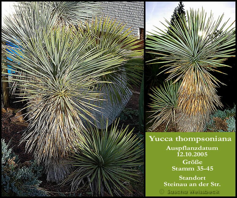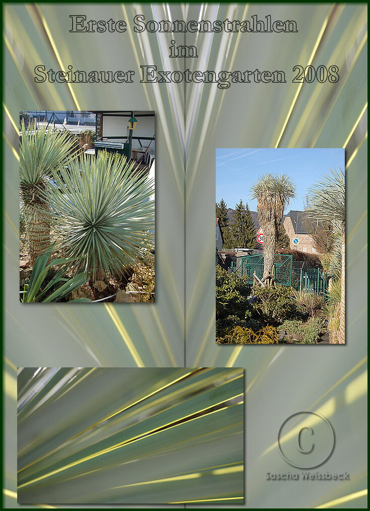 Weissbeck Der Hobbygärtner Sascha Weissbeck praktiziert die Exotengärtnerei bereits seit 1993. Seit 2002 wird der auf den Bildern dargestellte Garten in Steinau an der Straße angelegt und ausgebaut. Darin befinden sich Palmen wie beispielsweise Trachycarpus fortunei, T. takil, T. princeps, T. wagnerianus, T. fortunei x wagnerianus, Jubaea chilensis, Chamaerops humilis var. cerifera, C. humilis 'Vulcano', Trithrinax campestris und viele mehr. 2007 wurde einer der Höhepunkte des Steinauer Garten gesetzt: eine Yucca rostrata mit etwa 5,20 m Höhe. Desweiteren werden reichlich Kakteen, Dasyliriones und verschiedene Yuccas in seinem Garten kultiviert.