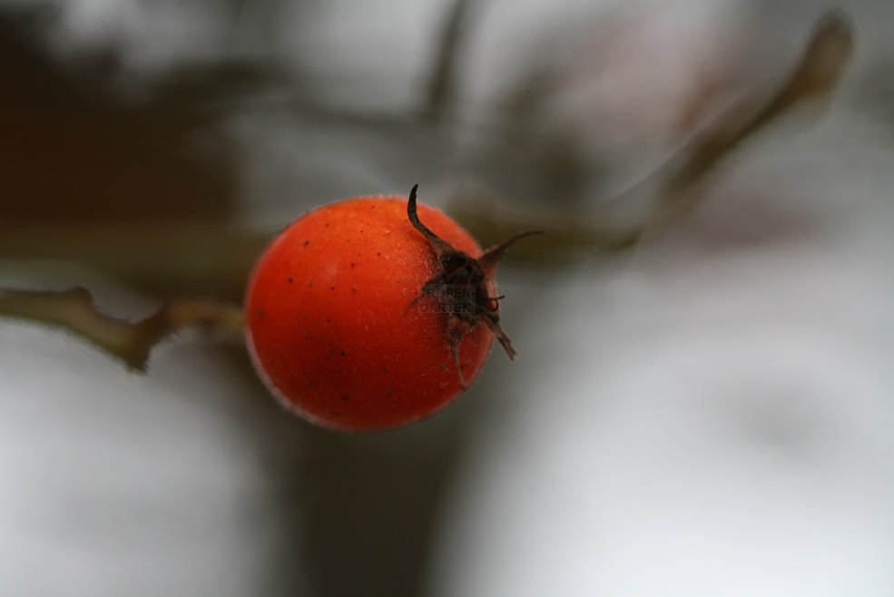 Die Blüten stehen in 7–8 cm langen Dolden, sind etwa 2 cm im Durchmesser groß, weiß mit 5–10 rosafarbenen Staubblättern. Später bilden sich elliptische bis kugelige, orange-rote, 1,8–2 cm lange, winterstehende Früchte, die meist 2 hellbraune Samen enthalten.