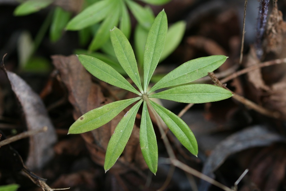 Die Pflanzen bilden unterirische Ausläufer. Die Stängel sind aufrecht, meist unverzweigt und bis auf einen Haarring unter den Nodien kahl. Die Laubblätter stehen unten zu 6 und oben zu 8(–10) in Wirteln, sind lanzettlich, 2–5 cm lang, 0,5–1,5 cm breit, kahl oder kurzhaarig, 1-nervig und zugespitzt.