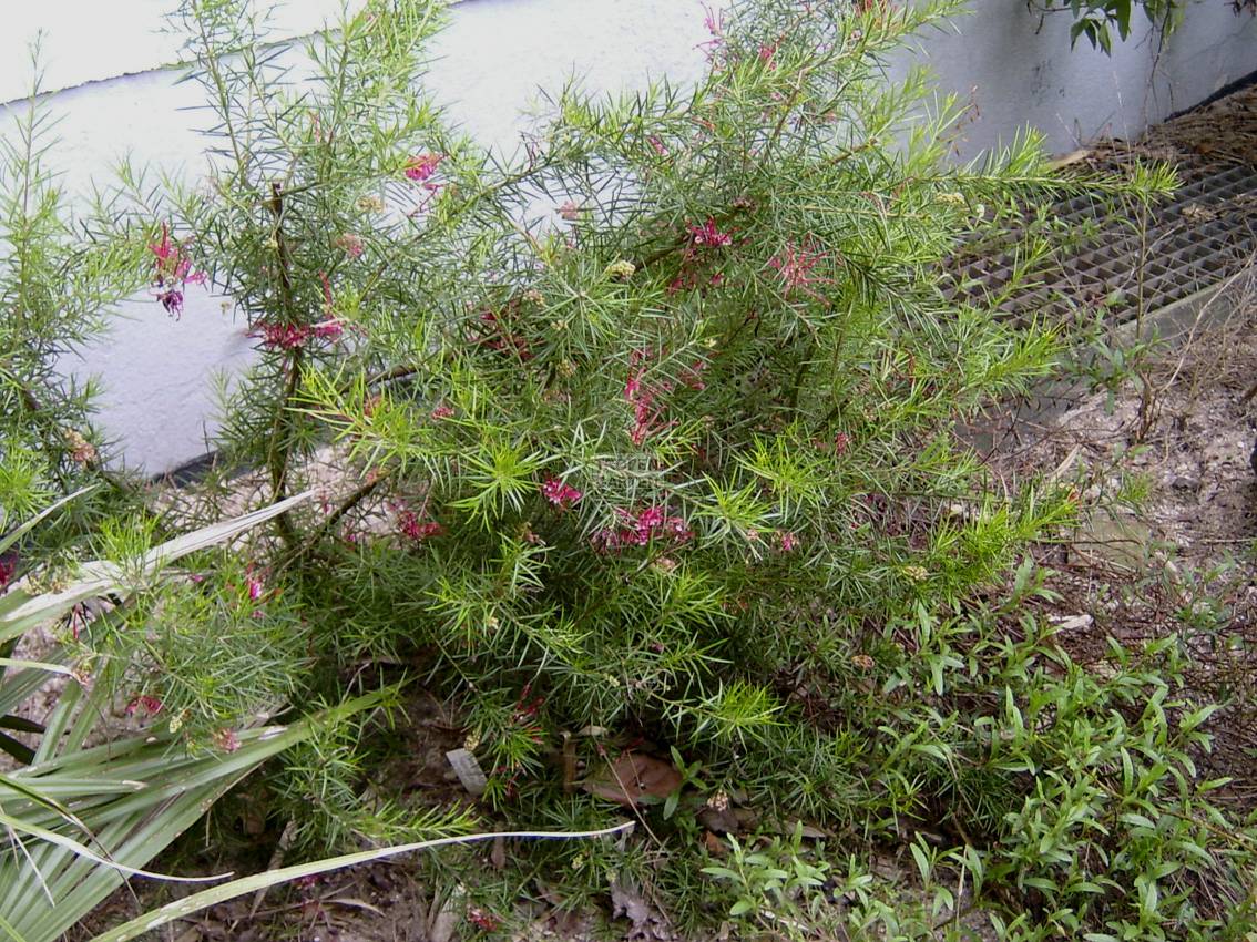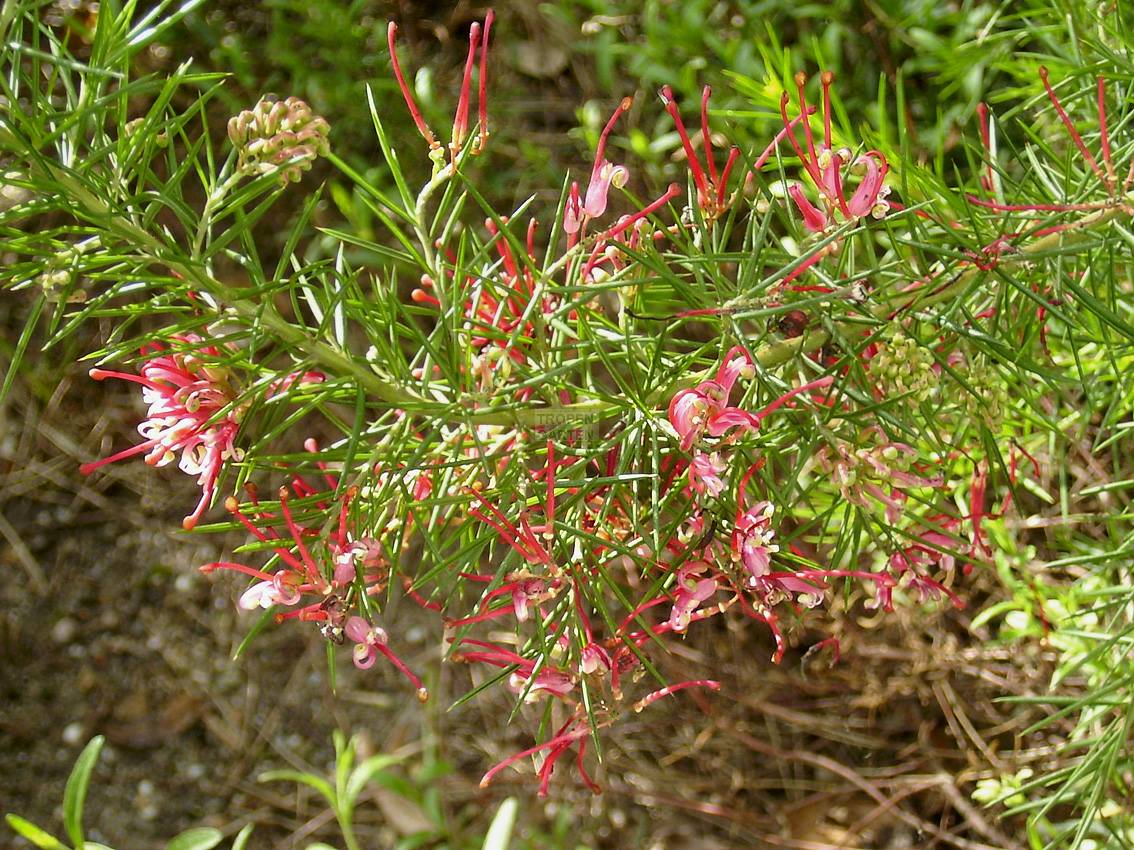 Grevillea thelemanniana R. Br. ex Meisn. ist eine bizarre Grevillea mit feinem, spinnenartigen Laub und schöner roter Blüte. Leider dürfte die Frosttoleranz für eine Freilandhaltung nicht reichen. Mit –8 °C oder etwas mehr ist die Grenze wahrscheinlich schon erreicht, Kübelhaltung.