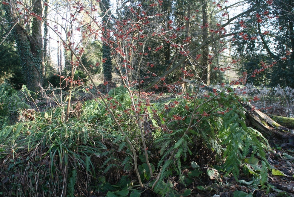Hamamelis ×intermedia ist als echter Winterblüher beinahe ein Muss für den Exotengarten. Selbst in kleineren Gärten kann man eine Pflanze integrieren. Von den zahlreichen Sorten können auch verschiedenblütige kombiniert werden oder solche mit unterschiedlichen Blühzeitpunkten. Am frühesten im Winter zeigt sich "Advent", spät hingegen "Carmine Red". Seitens der Farbe kann aus einer ganzen Palette von Kombinationen gewählt werden.