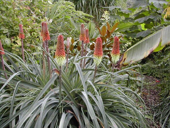 Kniphofia caulescens, mit leichtem Winterschutz in den milden Regionen gut harte, exotische Fackellilie. In normalen Wintern immergrün. Das Blatt ist silbrig-grün, ein sehr hübscher Effekt. Ideal für den Steingarten oder das Sukkulentenbeet. Im Exotengarten sollten Kniphofia spp. häufiger gepflanzt werden, da diese sowohl den immergrünen Strukturcharakter als auch die ornamentale Blüte miteinander vereinen.