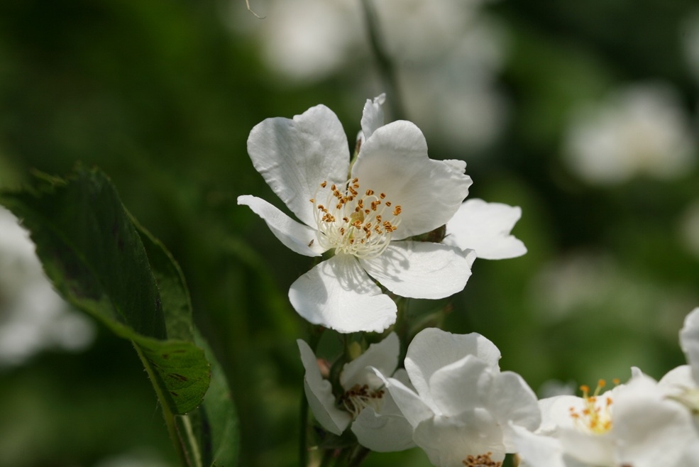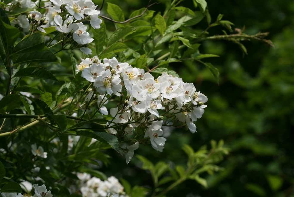 Die Blüten stehen in vielblütigen Rispen sind 1,5–2 cm im Durchmesser groß, duftend, weiß oder gelegentlich rosafarben. Die Griffel sind zu einer Säule verwachsen. Die Kelchblätter sind nach der Blüte zurück geschlagen, dann hinfällig. Später bilden sich kugelige, bis 5 mm im Durchmesser große, rote Sammelnussfrüchte (Hagebutten).
