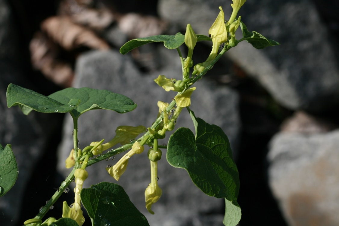 Abb. 60 Blüten der Osterluzei, Aristolochia clematitis L., auf einer Sandbank, 01.07.2023, 32 m, 51° 09' 34 N, 06° 50' 14 O