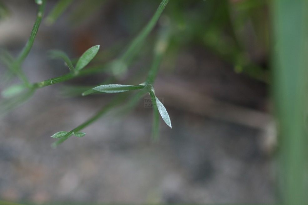 Die Pflanzen bilden halbkugelige Polster. Junge Zweige sind aufsteigend bis aufrecht, seidig behaart, mit 10–13 flachen Rippen und enden in einem Dorn, ältere Zweige sind verkahlend. Die Laubblätter sind gegen- oder wechselständig, länglich spatelförmig, behaart, rasch hinfällig, 7–13 mm lang und 2–3 mm breit.