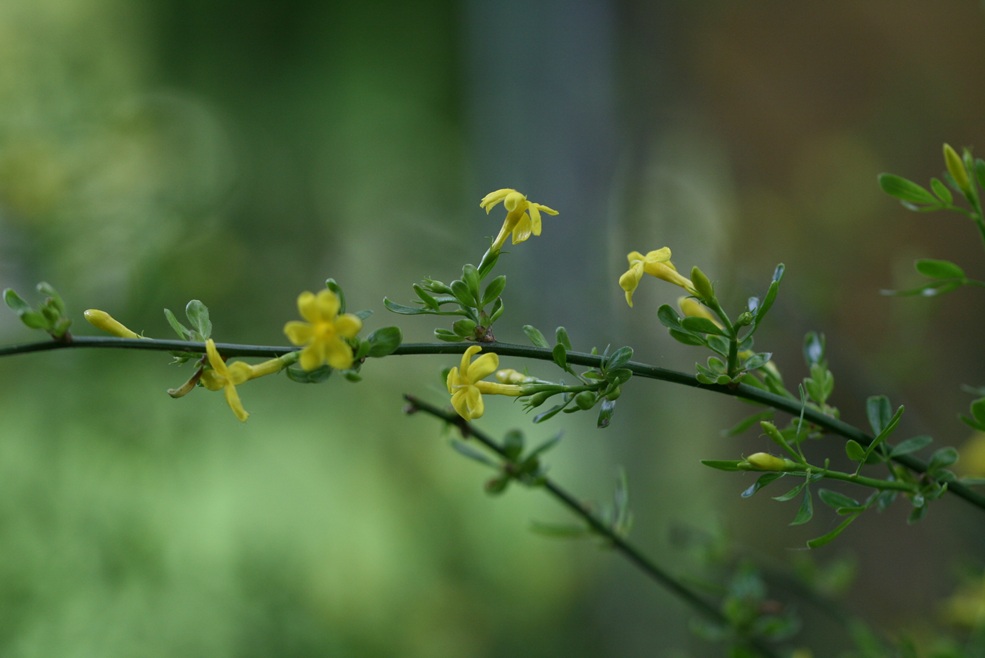 Die Blüten stehen zu 1-5 an kurzen Seitentrieben, sind nach den Blättern erscheinend, kaum duftend, gelb mit langer Röhre und 5 abgerundeten Kronblätter. Später bilden sich kugelige, glänzende, schwarze Früchte. Siehe auch Jasminum L.