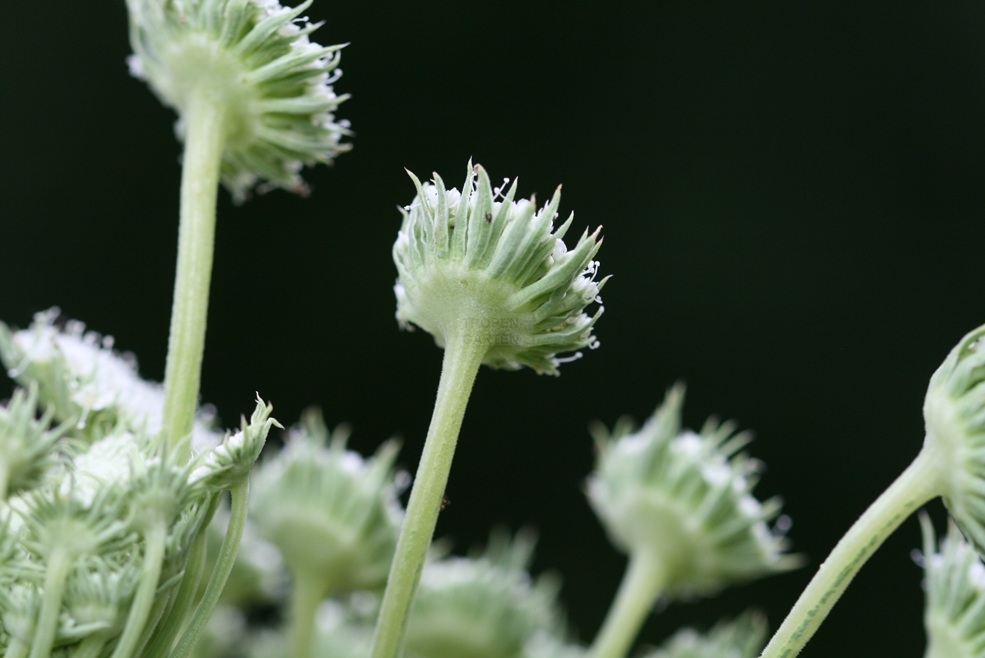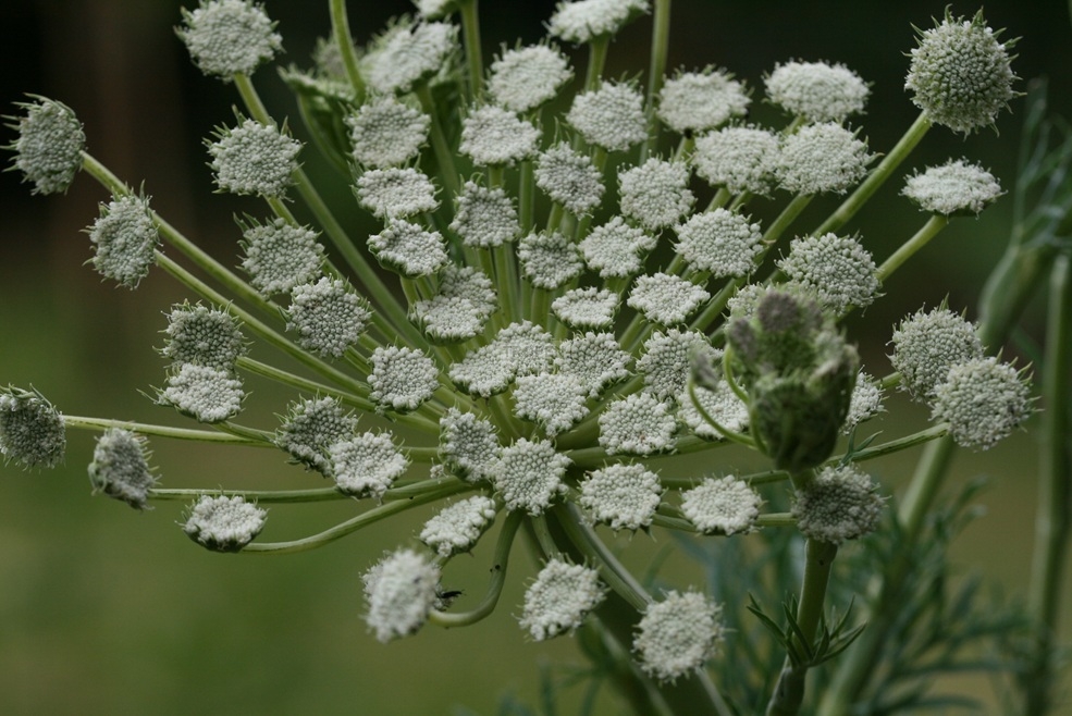 Die Hauptdolde ist größer und mehrstrahliger als die Seitendolden. Die Dolden sind 20–40-strahlig, mit außen längeren Döldchenstängeln und meist ohne Hüllblätter (Hüllblätter sind bei Doldenblütlern die Hochblätter direkt unterhalb des Blütenstandes, Hüllchenblätter jene unterhalb der Teildolden = Döldchen). Die Döldchen sind 60–70 blütig, halbkugelig oder kugelig, etwa 13 mm im Durchmesser groß; die Hüllchenblätter sind lanzettlich und unten breit verwachsen. Die Kronblätter sind weiß. Später bilden sich eiförmige, behaarte, 3–4 mm lange Früchte.