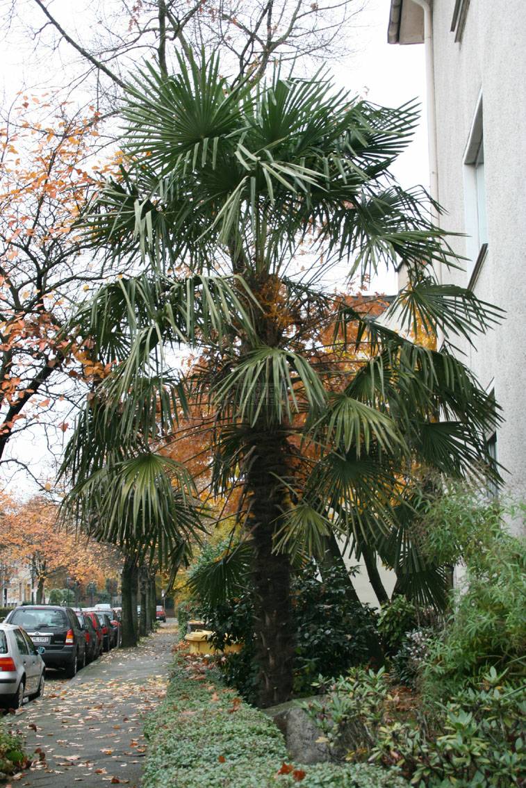 In einer wintermildesten Städte Mitteleuropas, Düsseldorf, finden sich seit vielen Jahrzehnten frei ausgepflanzte Exoten in privaten und öffentlichen Gärten. Nicht nur das milde Winterklima, Düsseldorf ist die Stadt mit den wenigsten Frost- und Eistagen, selbst im Vergleich zu den Nordseeinseln, auch die geschützte Lage im Innenstadtbereich prädestiniert geradezu, exotische Pflanzen im Freiland zu halten. Neben den in vielen Gärten vertretenden Yuccas, über die stammbildenden Arten Yucca gloriosa und Y. recurvifolia (siehe weiter unten), bis hin zu den buschigen Y. filamentosa und sehr häufig Y. flaccida, finden sich auffallend viele weitere exotische Pflanzen. Große Kamelien, reichlich Bambus, selbst in öffentlichen Grünanlagen oder als Straßenbegrünung, Paulownia tomentosa, Aucuba japonica, Viburnum tinus, Lorbeer, und und und. Am auffallendsten sind die jedoch an einigen Stellen anzutreffenden sehr alten Trachycarpus fortunei, von denen ich Ihnen hier einige Beispiele zeigen möchte.