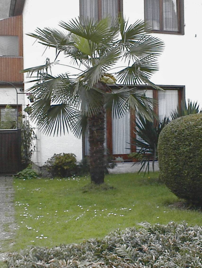 Auffallend an diesen Beispielen ist der Unterschied zwischen der ersten Hanfpalme, welche an der Nordseite des Hauses gepflanzt wurde und daher halbschattig bis vollschattig steht, aber eine deutlich bessere Krone aufweist als die beiden letzteren, welche in südwestlich bis südlicher Richtung gepflanzt sind und vollsonnig bis halbschattig stehen. Die Empfehlung, Trachycarpus-Arten eher an einem schattigen bis halbschattigen Standort auszupflanzen, lassen sich gut nachvollziehen. Sie gedeihen zwar an beiden Standorten, jedoch wirken Pflanzen mit Schatten gesünder.