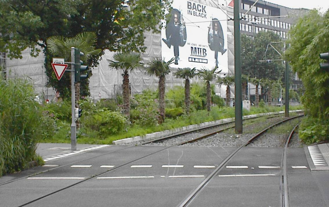 Hierbei handelt es sich um eine "Installation" der Düsseldorfer Künstlerin Tita Giese, die auch die Freilandexoten an den Hamburger Deichtorhallen gestaltet hat. Neben den großen Trachycarpus fortunei findet sich reichlich Bambus, der die Betonsünden der Hochstraße verdeckt. Nach dem ersten Jahr am 17.05.2003: