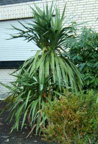 Ein weiteres Exemplar einer noch älteren Yucca recurvifolia im selben Stadtteil. Schön ist die Verzweigungstendenz am Kopf erkennbar. Mittlerweile 3 m groß und jedes Jahr reichlich blühend: