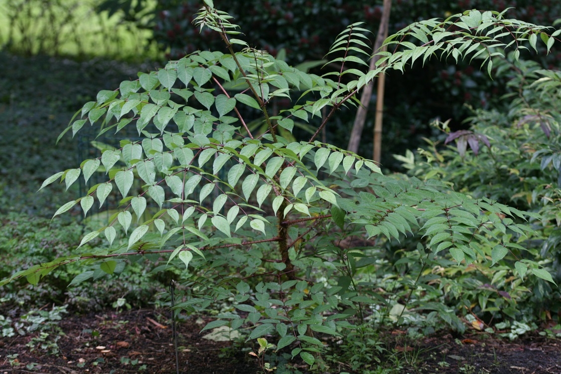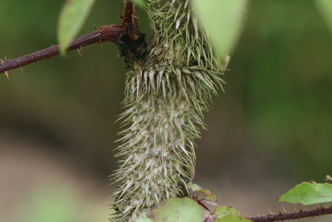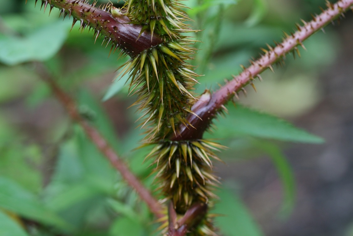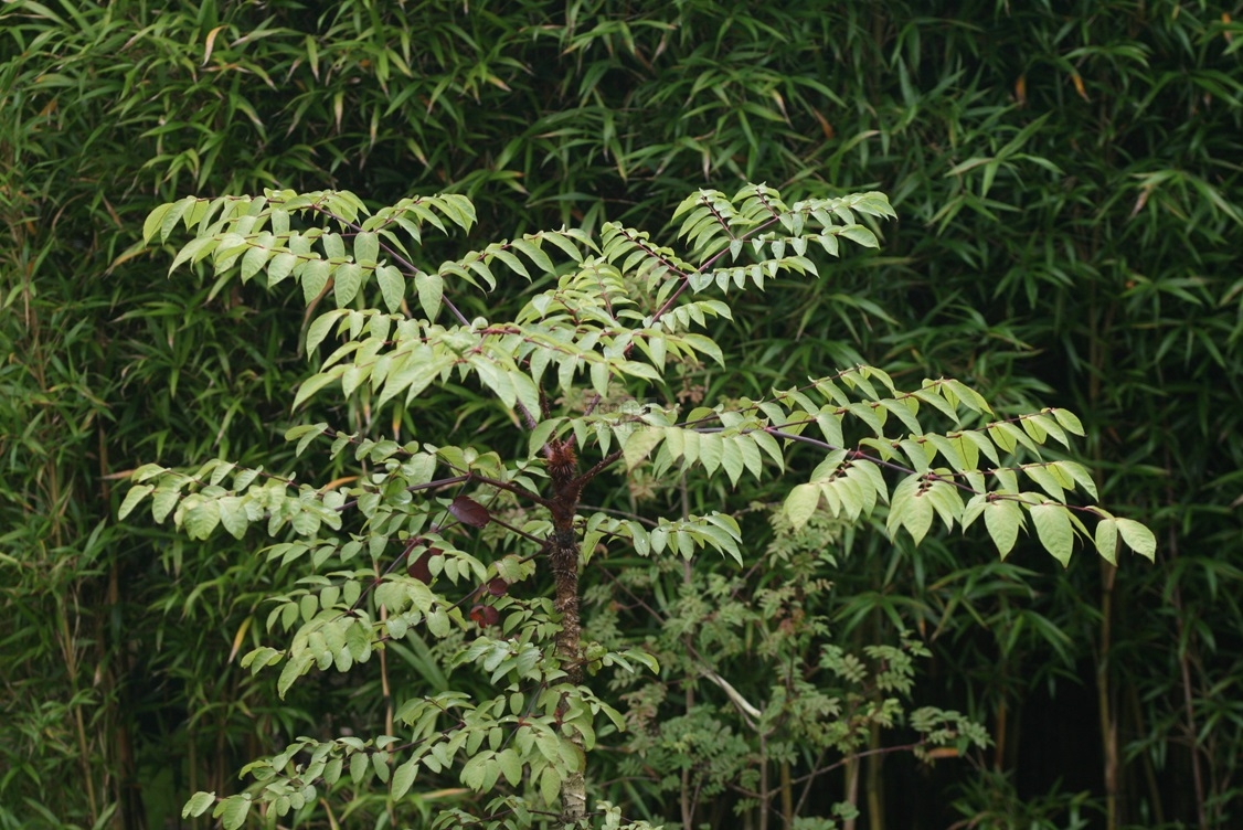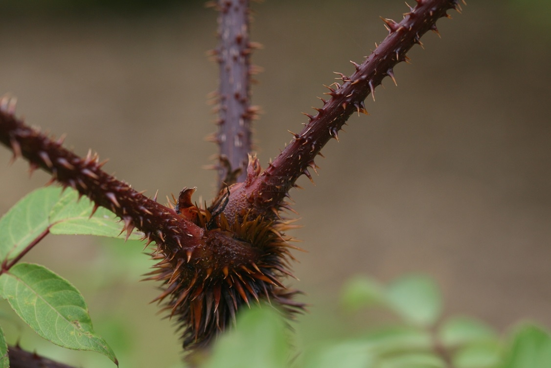 Die Pflanzen wachsen aufsteigend bis aufrecht und bilden gelegentlich Ausläufer. Die Stämme sind 2–10 m hoch, verzweigt, verholzend und wie die Zweige dicht mit braunen, 5–20 mm langen Stacheln bedeckt. Die Laubblätter sind unpaarig, 1–2-fach gefiedert mit zusätzlichen Blättchen an jeder Verzweigung der Blattachse. Der Blattstiel ist 30–44 cm lang. Die gestielten Laubblattabschnitte sind länglich-eiförmig bis lanzettlich, 6–14,5 cm lang, 2,5–8 cm breit, kahl und randständig gesägt.