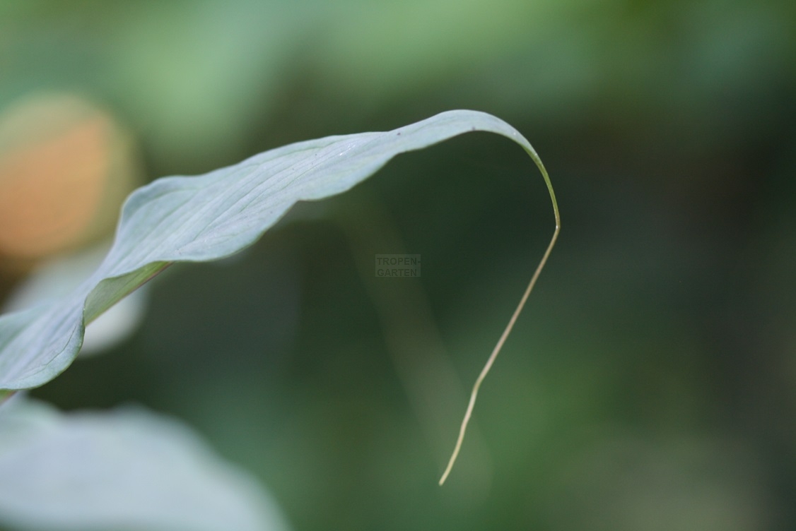 Der Blütenstiel ist kürzer als die Blattstiele, bis 75 cm lang, mit oder ohne undeutlichen weißlichen Streifen. Das Hochblattröhre ist zylindrisch, 6–7 cm lang, etwa 1,5 cm im Durchmesser breit, gewölbt und am Schlund zurückgebogen. Das Hochblattsegel ist tiefgrün, manchmal außen mit violettem Rand, innen hellgrün, 3-eckig bis eiförmig, 8–12 cm lang, 4–8 cm breit, an der Spitze mit violettem, fadenförmigem, 35 cm langem, hängendem Schwanz. An der Basis des Kolbens (= Spadix) finden sich 2 Gruppen von quirlständigen Blüten: oben die männlichen, unten die weiblichen Blüten. Die weibliche Zone ist kegelförmig, etwa 3,5 cm lang, 1,5 cm breit mit grünen, verkehrt eiförmigen Fruchtknoten. Die männliche Zone ist zylindrisch, 4–4,5 cm lang, 4–5 mm breit. Appendix blassgrün, zylindrisch oder schmal kegelförmig, etwa 7 cm lang, 2–4 mm breit, mit einigen spitzen kastanienförmigen Blüten am Grund. Der Fruchtstand ist nickend mit roten Beerenfrüchten.