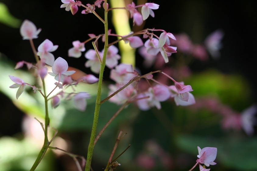 Die Blütenstände stehen terminal, sind traubenförmig, 2–6,5 cm hoch und kahl. Die Hüllblätter sind länglich, 3–4 mm lang, etwa 1,5 mm breit und entfernt gezähnt. Männliche Blüten sind 4-zählig, rosafarben, kahl oder unterseits behaart, mit 8–9 mm langem Blütenstiel; die äußeren 2 Perigonblätter sind länglich oder eiförmig-länglich, etwa 1 mm lang und 6–7 mm breit; die inneren 2 sind elliptisch, etwa 7 mm lang und 5 mm breit. Weibliche Blüten sind 3(–4)-zählig, mit 8–9 mm langem Blütenstiel; die äußeren Perigonblätter sind breit elliptisch, 9–10 mm lang, etwa 6 mm breit, kahl oder unterseits behaart; die inneren 1(–2) sind schmal länglich, 6–7 mm lang und 2–3 mm breit. Später bilden sich hängende, länglich verkehrt eifömige, etwa 10 mm lange, 6–7 mm breite, unregelmäßig 3-flügelige Kapselfrüchte. Siehe auch Begonia L.