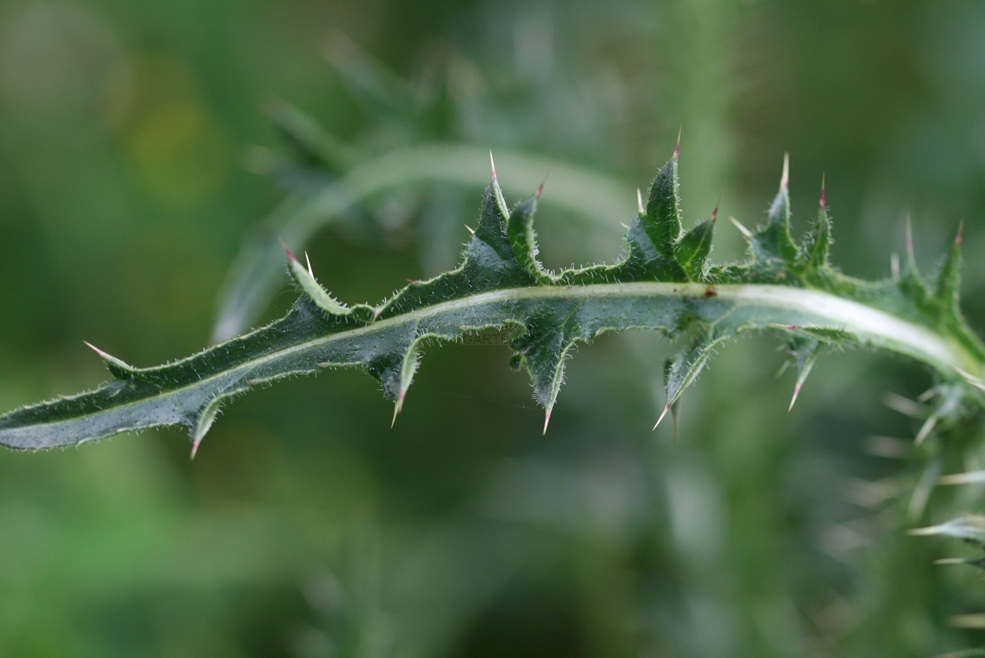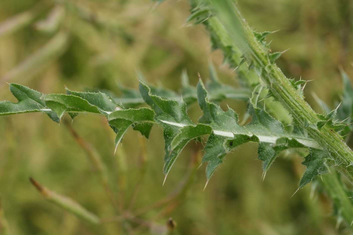 Die Pflanzen wachsen aufrecht. Die Stängel sind wenig verzweigt, dornig geflügelt, mehr oder wenger spinnwebig behaart, später verkahlend und bis fast zur Spitze beblättert. Die Laubblätter sind grün, den Stängel herablaufend, tief buchtig fiederspaltig mit dornig gezähnten, 3-eckigen Abschnitten und spinnwebiger Behaarung unterseits an der Mittelachse. Später verkahlen ist Laubblätter oft.