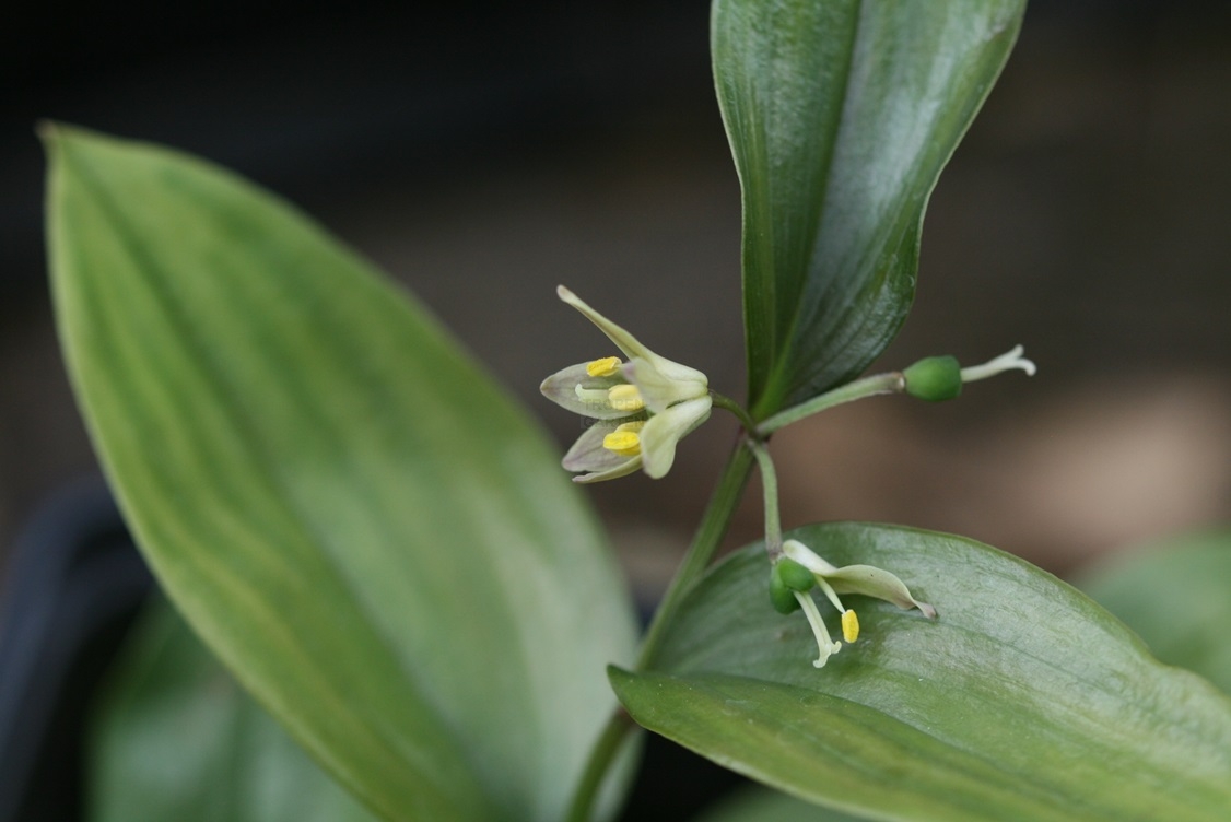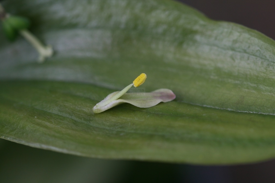 Die Art ist immergrün und bildet ein zylindrisches, fleischiges, 0,8–1,3 cm dickes Rhizom, auf dem bogenförmige, 20–30 cm hohe, grüne, unten lilafarben gesprenkelte Stängel sitzen. Die Laubblätter sind wechselständig, grün, randständig gewellt, oval-lanzettlich bis oval, 5–7 cm lang, 1,9–3,7 cm breit und haben einen 2–7 mm langen, längs lilafarben gestreiften Stiel.
