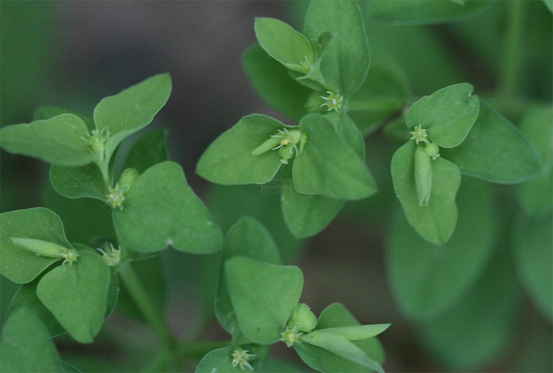 Wie für Euphorbien typisch werden die Blüten plus Hochblätter der Euphorbia peplus als Cyathium bezeichnet. Der Begriff leitet sich ab von gr. "kyathos" (= Schröpfgefäß) und beschreibt die becherartige Hülle aus Hochblättern unterhalb der Basis der Blüten, die man als "Ersatz" für die fehlenden Blütenblätter sehen kann. Cyathien sind meist grün oder gelblich und eher unscheinbar, bei E. peplus bestehen sie aus den grünen Hochblätterm plus Blütenorgane.