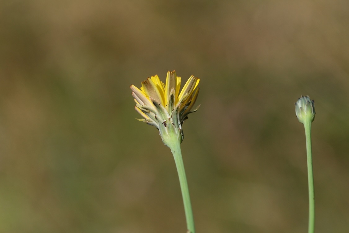 Die Pflanzen bilden eine Pfahlwurzel oft mit Seitenwurzeln und basale Blattrosetten. Die Stängel sind aufrecht, locker verzweigt oder unverzweigt, blaugrün, kahl oder unten steifhaarig, blaugrün, unterm dem Köpfchen kaum verdickt, mit 0–2 Laubblättern und wenigen Schuppenblättern. Die Grundblätter sind grün, ungefleckt, zerstreut borstig behaart, entfernt buchtig gezähnt bis ganzrandig, dem Boden angedrückt. Die Köpfchen sind 20–35 mm im Durchmesser groß, mit zitronengelben Blüten, die etwa 2mal so lang wie die Spreublätter sind. Die Hüllblätter sind länglich, kahl oder schwach borstig behaart. Später bilden sich lang geschnäbelte Früchte mit 2-reihigem Pappus, innen fedrig, außen kaum fedrig.