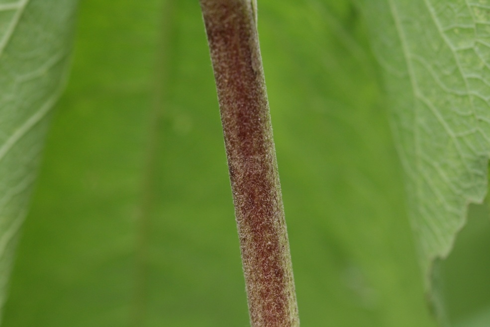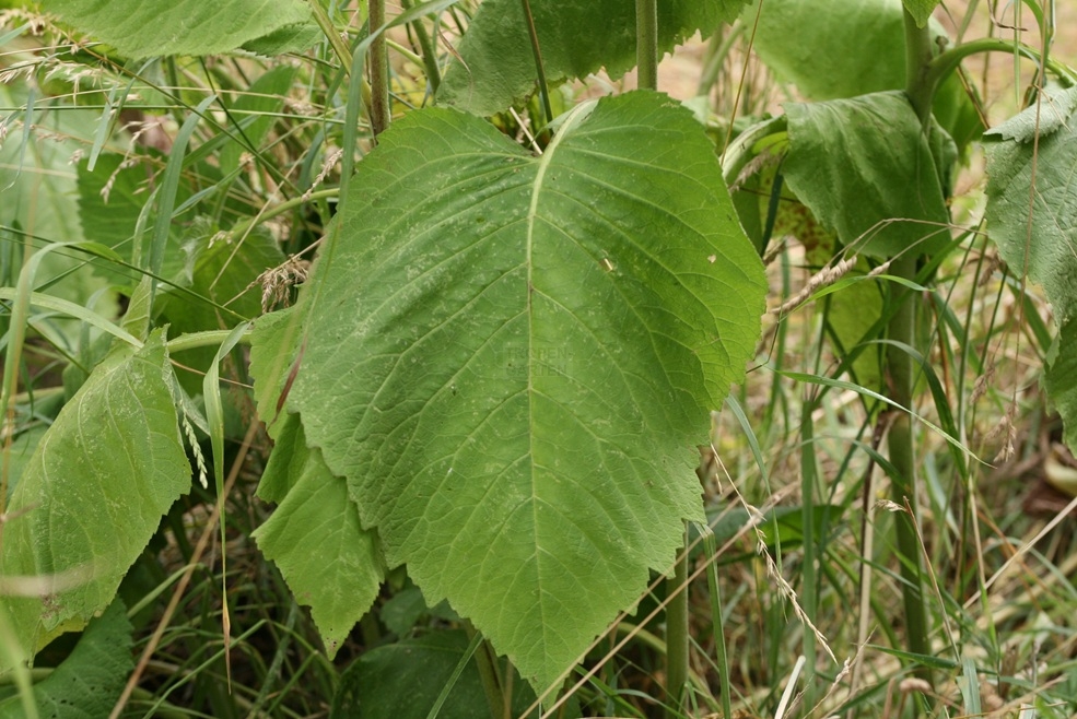 Die Pflanzen können sich über Wurzelausläufer ausbreiten. Die Stängel sind verzweigt, mehr oder weniger abstehend behaart. Die Laubblätter sind eiförmig bis elliptisch-eiförmig, 16–50 cm lang, 6–24 cm breit, gezähnt, oberseits dunkelgrün und kahl, unterseits dicht graufilzig. Grundblätter und untere Stängelblätter sind 5–10 cm lang gestielt, obere Stängelblätter sitzend bis halbstängelumfassend.