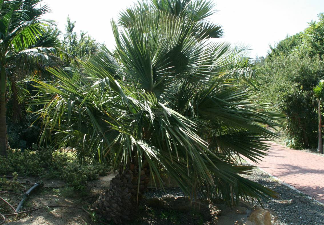 Livistona muelleri F. M. Bailey, die Zwerg-Schirmpalme, stammt aus Australien und hat einen schwärzlichen Stamm mit meist steifen, rundlichen, dunkelgrünen Laubblättern. Gedeiht gut in tropischem Klima.